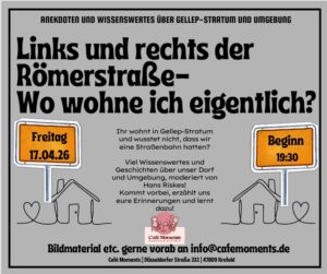 Habt ihr noch alte Fotos, Dokumente oder spannendes Bildmaterial im Keller oder auf dem Dachboden? Wir freuen uns, wenn ihr uns diese vorab per E-Mail an info@cafemoments.de schickt, damit wir sie am Abend teilen können.